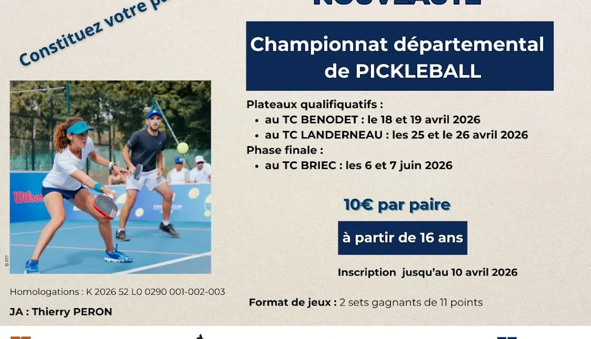 AccueilActualitésChampionnat départemental de PickleballChampionnat départemental de PickleballArticleTennis17 mars 2026Agrandir l'imageSur le même sujetArticleTennisVoir tous les articles